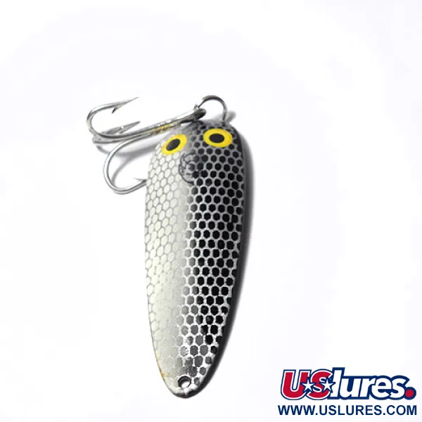 Mit einem Gewicht von 28 g (1 oz) ist dieser massive Blinker ein klassisches Stück amerikanischer Tackle-Geschichte. Der 9 cm (3 1/2") lange Körper verfügt über ein silbernes Finish mit einem schwarzen Wabenmuster und zwei markanten gelben Augen, bekannt als Farbschema Natural. Auf der Rückseite identifiziert die tiefe Prägung „DARDEVLE DETROIT USA“ die Herstellung durch Eppinger vor deren Umzug nach Dearborn im Jahr 1959. Dieses Exemplar mit dem Produktcode 0243 befindet sich in einem Zustand von 5/5 und weist die spezifische konkave Form auf, die durch die firmeneigenen Matrizen des Herstellers erzielt wurde. Die Hardware besteht aus einem robusten Drilling, der durch einen hochbelastbaren Sprengring gesichert ist. Diese Konstruktion aus dickem Metall wurde entwickelt, um weite Würfe zu ermöglichen und den Köder bei gleichmäßigem Einholen auf Tiefe zu halten, wobei er eine konstante taumelnde Aktion erzeugt.