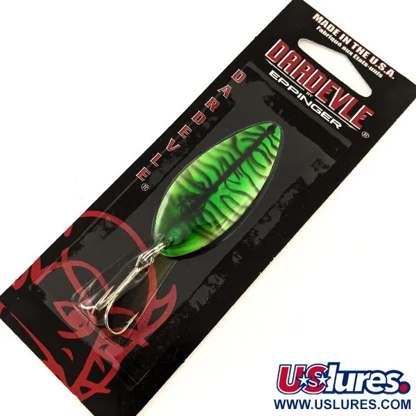 Selbstleuchtende Eigenschaften zeichnen das Mackerel (N) / Nickel-Finish dieses speziellen Exemplars aus, was es zu einem Highlight für schlechte Lichtverhältnisse macht. Mit einem Gewicht von 14 g (1/2 oz) und einer Länge von 5,5 cm (2 1/4") besitzt dieser Dardevle Devle Dog UV von Eppinger die klassische längliche Form, die seit 1906 ein fester Bestandteil aus Detroit ist. Die kontrastreichen grünen und schwarzen Tigerstreifen sind auf einer Nickelbasis aufgebracht, um die Sichtbarkeit bei unterschiedlichen Wassertrübungen zu gewährleisten. Dieser spezielle Blinker, geführt unter dem Produktcode 13091, befindet sich in unbenutztem Zustand und ist noch in der originalen schwarz-roten Blisterverpackung untergebracht. Die Hardware besteht aus einem robusten, silberfarbenen Drillingshaken, der durch einen hochbelastbaren Sprengring gesichert ist, bereit zum Werfen oder Schleppangeln. Eppinger verwendet weiterhin firmeneigene Matrizen für diese in Amerika hergestellten Löffelköder, um sicherzustellen, dass die konkave Oberfläche mit den Entwürfen übereinstimmt, die Lou Eppinger vor über einem Jahrhundert in seinem Keller handgefertigt hat. Unter UV-Licht strahlen die Chartreuse-Abschnitte des Makrelenmusters in einem hellen Neongrün und bieten ein ausgeprägtes Profil in tiefem oder trübem Wasser.