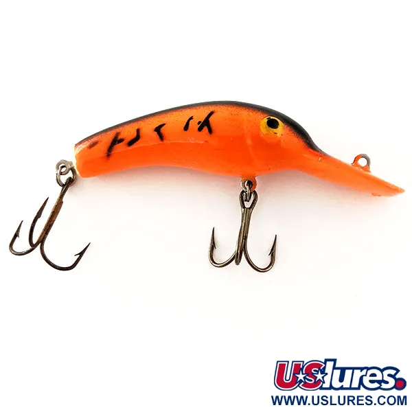 Dieser vintage Lindy Shadling UV im auffälligen Orange Tiger-Dekor wiegt 3/16oz (5,5g). Er ist ein authentisches Stück amerikanischer Angelgeschichte aus den 1980er Jahren, hergestellt von der Lindy / Little Joe Company in den USA. Mit einer Länge von 2" (5cm) imitiert das Körperprofil kleine Shads oder Weißfische, ergänzt durch einen markanten Rundrücken und eine ausgeprägte Tauchschaufel. Dieses Exemplar mit der Artikelnummer 11885 ist mit einem speziellen UV-Finish versehen, das die Sichtbarkeit in trübem Wasser oder bei wenig Licht erhöht. Die Montage besteht aus zwei Drillingshaken an Bauch und Schwanz. Die Lackierung ist makellos, die schwarzen Tigerstreifen bilden einen scharfen Kontrast zur fluoreszierenden orangen Basis. Der Gesamtzustand ist außergewöhnlich sauber (Bewertung 5/5). Ein dunkler, schmaler Streifen verläuft entlang des Rückens bis zu den realistisch platzierten Augen am Kopf.