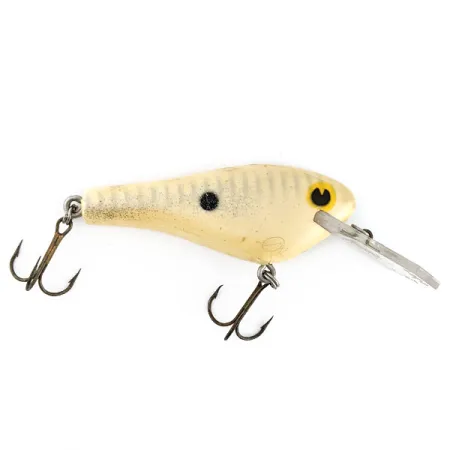 Mit 16 g (3/5 oz) vermittelt dieser handgefertigte Crankbait aus Zedernholz das solide Gefühl, das Poe's zu einer festen Größe im Turnier-Bassangeln gemacht hat. Der Super Cedar RC-3, identifizierbar durch den Produktcode 22032, verfügt über einen 7 cm (2 3/4") langen Körper aus gedrechseltem Zedernholz – ein Material, das aufgrund seiner Dichte und seines Auftriebs beim Wurf gewählt wurde. Dieses Exemplar ist im klassischen Cream Shad Dekor gehalten, akzentuiert durch einen markanten schwarzen Seitenpunkt und gelbe Augen mit dunklen Pupillen. An der Vorderseite ist eine breite, klare Tauchschaufel aus Kunststoff befestigt, die den Köder bei gleichmäßigem Einholen auf Tiefe bringt. Die Hakenbestückung besteht aus den zwei originalen Bauch- und Schwanzdrillingen, die leichte Altersspuren aufweisen, welche die Geschichte des Köders widerspiegeln. Hergestellt in den USA, weist der Körper ein gepflegtes Erscheinungsbild auf und erhält aufgrund leichter Gebrauchsspuren eine Zustandsbewertung von 4/5.
