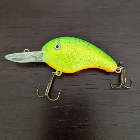 Unter Lichteinfall schimmernd, sorgt das mit Glitzer versetzte, neongrün-gelbe Finish für eine hohe Sichtbarkeit dieses Tiefläufers in der Wassersäule. Dieser Strike King 4XD mit dem Produktcode 16418 ist 5 cm lang und wiegt 10 g, was ihn zu einer ausgezeichneten Wahl sowohl für das Wurfangeln als auch für das Schleppangeln macht. Seine verlängerte, klare Tauchschaufel ist darauf ausgelegt, Lauftiefen von 2,4 bis 3,6 m zu erreichen, um gezielt Zander und Hechte in der Nähe von tiefer liegenden Strukturen anzusprechen. Die interne Rasselkammer verleiht seiner Präsenz eine rhythmische akustische Komponente. Dieses spezielle Exemplar zeigt mit einer Zustandsbewertung von 3/5 seine Einsatzgeschichte, weist leichte Gebrauchsspuren an der Oberfläche auf und verfügt über originale Drillingshaken, die zwar gealtert, aber voll funktionsfähig sind. Der Übergang vom leuchtenden Chartreuse auf dem Rücken zum dezenten orangefarbenen Bauch spiegelt die klassischen Farbpaletten wider, für die Strike King bekannt ist.