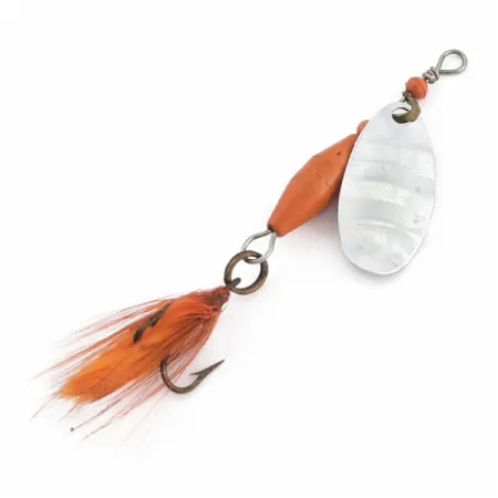 Die deutlich in das Silberblatt eingeprägten Markierungen kennzeichnen diesen speziellen Abu Garcia Spinnaren Reflex als ein gut erhaltenes Exemplar. Der Spinner mit einem Gewicht von 1/8 oz (4 g) ist um ein vernickeltes Blatt mit Vertiefungen herum aufgebaut, das für konstante Lichtreflexe sorgt. Der leuchtend orangefarbene Körper wird durch passende orangefarbene Hechelfedern am Drilling ergänzt, die dem 5 cm langen Profil Volumen verleihen. Rote Kunststoffperlen auf dem Drahtgestell fungieren als Lager, um die Rotation des Bügels beim Einholen zu erleichtern. Dieser Köder ist unter dem Produktcode 24622 registriert und weist einen Zustand von 5/5 auf, wobei alle Komponenten vollständig intakt sind.