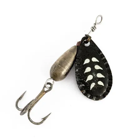 Mit einem Gewicht von 4g (1/8 oz) verfügt dieser in Schweden hergestellte Spinner über ein klassisches tropfenförmiges Spinnerblatt mit einem markanten schwarzen Finish und sieben weißen Akzenten. Die Einprägungen ABU SWANGSTA DROPPER 1 und SWEDEN sind auf der Rückseite des geriffelten Blattes deutlich lesbar – ein Kennzeichen für die handwerkliche Qualität der frühen Abu Garcia Produktion. Mit einer Gesamtlänge von 4,5 cm (1 3/4") bietet der messingfarbene Körper des Köders das nötige Gewicht für das Werfen mit leichtem Gerät. Dieses spezifische Exemplar, identifiziert durch den Produktcode 22187, verfügt über eine kleine rote Perle, die als Lager dient, um eine reibungslose Rotation zu gewährleisten. Der Zustand dieses Köders wird mit 5/5 bewertet; er wirkt wie frisch vom Band gelaufen, wobei das Werksfinish vollständig erhalten ist. Ein gezackter Rand am schwarzen Blatt verleiht dem Profil Struktur und kontrastiert mit dem glatten, polierten Messingkörper, der in einen Standard-Drilling übergeht.