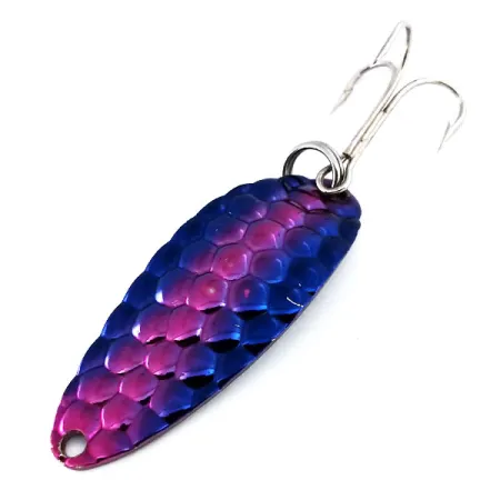 Mit einem Gewicht von 9g (1/3oz) verfügt dieser in den USA hergestellte Blinker über ein markantes, breitflächiges Profil, das speziell für weite Würfe entwickelt wurde. Die Vorderseite zeigt ein hexagonales Schuppenmuster in einem Farbverlauf von Violett zu Tiefblau, während die Rückseite in sauberem, poliertem Nickel gehalten ist. Mit einer Länge von 4,5 cm (1 3/4") wird dieser Acme Little Cleo unter der Artikelnummer 10271 geführt und befindet sich in einem makellosen 5/5-Zustand. Die Ausstattung umfasst einen werkseitig montierten Sprengring und einen scharfen Drillingshaken, beide ohne jegliche Alterserscheinungen. Der Korpus aus gestanztem Stahl ist mit einer Öse für die Schnur am schmalen Ende und einer Hakenbefestigung am breiteren hinteren Ende versehen. Die gestanzte Bohrung an der Vorderseite ist präzise verarbeitet, um eine direkte Verbindung zur Schnur oder einem Wirbel zu ermöglichen.