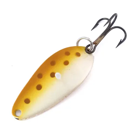 Mit einer Länge von genau 1 1/2" (4 cm) weist dieser klassische Blinker ein traditionelles amerikanisches Profil auf, das Sammler sofort erkennen. Die Vorderseite ist im zweifarbigen Brown Trout-Dekor gehalten, das eine cremeweiße untere Hälfte mit einem goldgelben oberen Bereich kombiniert, der von sieben deutlichen dunkelbraunen Punkten markiert wird. Auf der Rückseite ist das polierte Goldmetall tief mit "LITTLE CLEO ®" und dem Gewicht von 1/4oz (7g) gestempelt, ein Beleg für die Fertigungsstandards der Marke Acme in den USA. Mit einer Zustandsbewertung von 5/5 behält der Köder seinen ursprünglichen Glanz auf dem gesamten Körper bei. Die Hardware besteht aus einer einzelnen Öse am schmalen Ende und einem robusten Sprengring, der einen dunklen Drilling am Schwanz sichert. Die Artikelnummer 10567 stellt ein gut erhaltenes Exemplar dieses vielseitigen Wurfkörpers dar, der ein sauberes Finish sowohl auf den lackierten als auch auf den metallischen Oberflächen aufweist.
