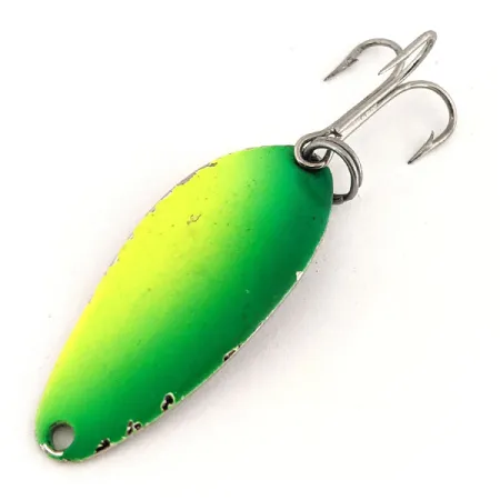 Der Name „LITTLE CLEO ®“ und das Gewicht von 1/4 oz. (7 g) sind deutlich in die vernickelte Rückseite eingeprägt und weisen diesen Löffelblinker als echtes Stück nordamerikanischer Angelgeschichte aus. Ein lebendiger Farbverlauf von Grün nach Gelb bedeckt die konvexe Oberfläche – ein klassisches Acme-Farbschema, das für maximale Sichtbarkeit bei verschiedenen Wassertrübungen entwickelt wurde. Während das lackierte Finish einige Gebrauchsspuren und leichte Abplatzer an den Kanten aus der Angelkiste aufweist, bleibt das darunter liegende Metall glänzend, was zu einer Zustandsbewertung von 4/5 führt. Die Ausstattung dieses 4 cm (1 1/2") langen Exemplars besteht aus einem stabilen Sprengring und einem scharfen Drillingshaken – Markenzeichen der zuverlässigen US-Fertigung, die Sammler von dieser Marke erwarten. Dieser spezielle Köder mit der Artikelnummer 12746 verfügt über die ikonische, bucklige Körperform, die den Little Cleo zu einem Favoriten für das Auswerfen in stehenden und fließenden Gewässern gemacht hat.