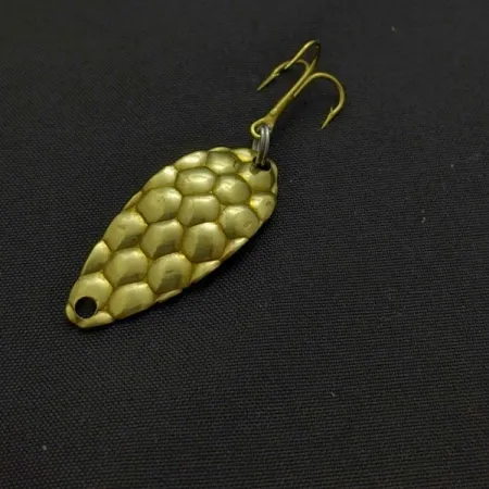 Das strukturierte Blasenmuster auf der konvexen Seite dieses 1 1/4" (3 cm) langen Goldblinkers erzeugt eine markante visuelle Signatur für Würfe mit leichtem Gerät. Mit einem Gewicht von 1/8 oz (3,5 g) verfügt dieser Acme Little Cleo über ein gestanztes Schuppenfinish, das Licht einfängt und reflektiert. Die Unterseite des Blinkers ist glatt gehalten, wobei der Herstellername in das Metall eingeprägt ist. Produktcode 24586, Zustand 5/5. Ein goldfarbener Drillingshaken ist am Heck montiert und ergänzt das metallische Erscheinungsbild des Körpers.