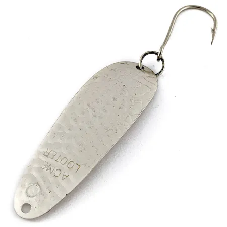 Die gehämmerte Silberoberfläche des 4 g (1/8 oz) schweren Körpers erzeugt eine facettenreiche Reflexion, die beim Schleppfischen das Licht effektiv einfängt. Dieser 6 cm (2 1/4") lange Acme Looter, gekennzeichnet durch den Produktcode 20485, ist ein spezialisierter Blinker, der die schlichte Funktionalität klassischer amerikanischer Metallköder repräsentiert. Die Rückseite ist glatt und mit einer deutlichen Hersteller- und Modellprägung versehen, wobei sich das gesamte Stück in einem hervorragenden Zustand (5/5) präsentiert. Ein Einzelhaken ist über einen stabilen Sprengring am hinteren Ende des tropfenförmigen Körpers befestigt, während die Kopfseite über eine präzise gebohrte Öse zur Schnurbefestigung verfügt.