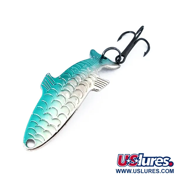 Mit einem Gewicht von exakt 4 g (1/8 oz) präsentiert dieser Blinker ein detailliertes Schuppenmuster mit einem Farbverlauf von kräftigem Petrolblau am Rücken bis hin zu einem glänzenden Nickelfinish. Dieser in den USA hergestellte Acme Phoebe, identifiziert durch den Produktcode 10352, misst 4 cm (1 1/2") und besticht durch eine markante Fisch-Silhouette mit eingeprägten Kiemendeckeln und Flossen für ein realistisches 3D-Profil. Die Rückseite besteht aus sauberem, poliertem Nickel und trägt die Prägung der Marke Acme sowie des Modells Phoebe. Ausgestattet mit originalen, dunkel beschichteten Drillingen und einem stabilen Sprengring, befindet sich die Hardware in ausgezeichnetem Zustand. Mit einem Zustandswert von 6 ist der Köder unbenutzt und glänzt wie am ersten Tag. Seine spezielle hydrodynamische Form ist auf Vielseitigkeit ausgelegt und ermöglicht das Angeln in verschiedenen Tiefen der Wassersäule.