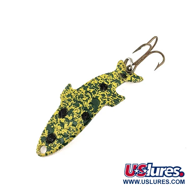 Dieses Exemplar zeichnet sich durch ein markantes 'Frog'-Dekor aus, bestehend aus grünen und gelben Spritzern, die mit kräftigen schwarzen Punkten auf dem geschwungenen Metallkörper akzentuiert sind. Mit einem Gewicht von 1/8 oz (4 g) und einer Länge von 1 1/2" (4 cm) weist der Köder die charakteristische anatomische Silhouette auf, die den Acme Phoebe seit Jahrzehnten zu einem Favoriten in jeder Tackle-Box macht. Dieser spezifische Artikel mit der Artikelnummer 11506 ist unbenutzt und weist sein originales Finish auf. Auf der sauberen, silberfarbenen Rückseite ist der Name 'PHOEBE' mittig deutlich in das Metall geprägt. Die Hardware besteht aus einem scharfen, brünierten Drilling, der durch einen zuverlässigen Sprengring am Schwanzende gesichert ist. Dank des dreidimensional geprägten Designs präsentiert der Köder beim Auswerfen oder Schleppen aus verschiedenen Blickwinkeln ein realistisches Beutefischprofil.