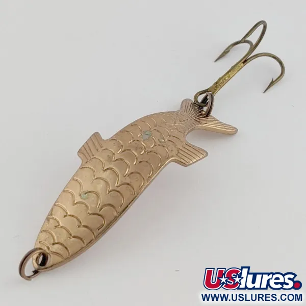Dieser 5 cm lange Blinker wurde aus massivem Messing gestanzt und mit einem tiefen Kupfer-Finish versehen. Das gebogene Profil erzeugt unter Wasser eine realistische dreidimensionale Silhouette. Auf dem Körper sind detaillierte Schuppenmuster sowie Flossen im Schwanzbereich eingeprägt, um einen Beutefisch zu imitieren. Mit einem Gewicht von 7 g verfügt der Metallkörper über eine subtile S-Kurve, die beim Einholen für eine konstante, seitlich ausschlagende Schwimmbewegung sorgt. Die Rückseite des Blinkers ist deutlich mit dem Herstellerlogo gestempelt, und der Zustand des Köders ist eine glatte 5/5. Primär für das Wurfangeln konzipiert, ist die Hardware durch präzise gestanzte Löcher befestigt, was die Balance dieses Vintage-Löffelköders (Produktcode 24453) bewahrt.
