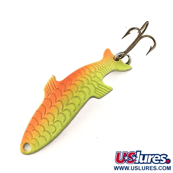 Mit einem einzigartigen gebogenen Profil und geprägten Schuppen ahmt dieser Blinker die anatomischen Details eines kleinen Beutefisches nach. Mit einem Gewicht von 4 g (1/8 oz) und einer Gesamtlänge von 4 cm (1 1/2") ist der Acme Phoebe UV (Produktcode 11487) mit hydrodynamischen Eigenschaften ausgestattet, die eine dreidimensionale Illusion erzeugen. Das gelb-orangene Farbverlaufsfinish ist mit fluoreszierenden Pigmenten behandelt, sodass der Köder unter UV-Licht intensiv leuchtet, was die Sichtbarkeit in trübem oder tiefem Wasser erhöht. Als unbenutztes Exemplar behält er die ursprüngliche Werkslackierung und die scharfen Prägedetails bei. Der gebogene Körper ist für Vielseitigkeit in verschiedenen Tiefen und Einholgeschwindigkeiten ausgelegt. Ein Drillingshaken mit Bronze-Finish ist am Heck befestigt und vervollständigt dieses klassische Acme-Design.