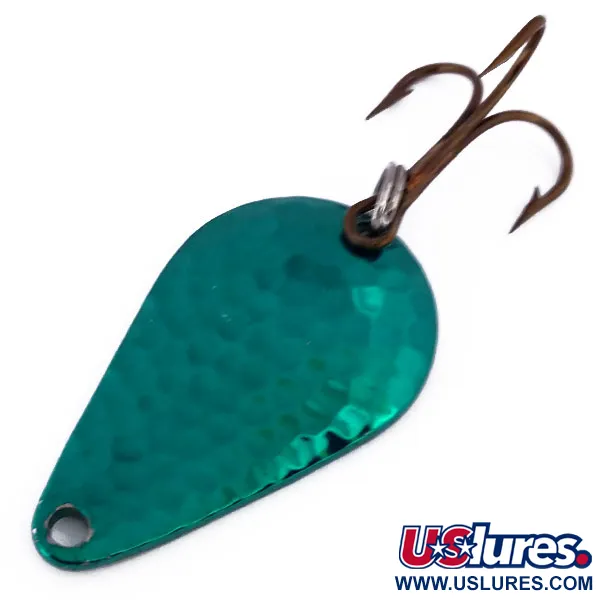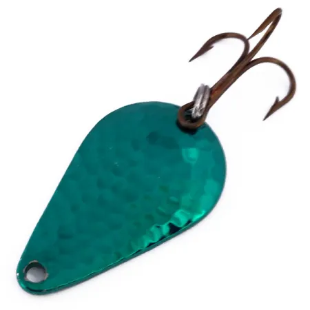 Gehämmertes grünes Finish fängt das Licht auf der Vorderseite dieses 14 g (1/2 oz) Blinkers ein und bietet eine strukturierte Oberfläche, die einen Kontrast zur glatten Nickel-Rückseite bildet. Dieser Acme Stee-Lee (Produktcode 10368) misst 4,5 cm (1 3/4") und weist die klassische Tropfenform auf, die man aus Vintage-Sammlungen US-amerikanischer Angelausrüstung kennt. Die Rückseite des Köders ist deutlich mit der Herstellermarke geprägt, was die Herkunft aus den USA bestätigt. Ein scharfer Drillingshaken ist über einen robusten Sprengring am Heck befestigt. Das gesamte Exemplar ist unbenutzt und mit der Note 6 bewertet. Das schwere Metall ermöglicht weite Würfe und hilft dem Köder, beim Einkurbeln schnell auf Tiefe zu kommen. Weder auf der leuchtend grünen Vorderseite noch auf der Nickelbeschichtung sind Gebrauchsspuren sichtbar.