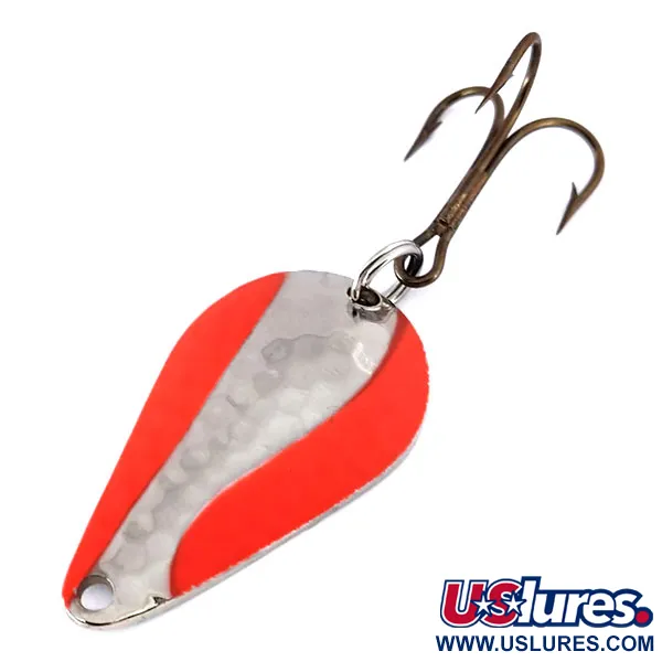 Ein vernickelter Körper kombiniert mit fluoreszierenden orangefarbenen Streifen prägt das optische Profil dieses 4,5 cm (1 3/4") großen Acme Stee-Lee UV. Mit einem Gewicht von 14 g (1/2 oz) weist der Blinker eine dezente Hammerschlag-Struktur auf seiner metallischen Oberfläche auf, die mit den hochsichtbaren Pigmenten interagiert. Unter UV-Licht verwandeln sich die orangefarbenen Bänder in ein leuchtendes Rotorange, eine technische Eigenschaft für die Sichtbarkeit in tiefem Wasser oder bei schlechten Lichtverhältnissen. Dieses Exemplar mit dem Produktcode 10371 ist unbenutzt und hat eine Zustandsbewertung von 6. Die Hardware besteht aus einem brünierten Drillingshaken an einem Sprengring, was den hohen Qualitätsstandards des Herstellers entspricht. Ein sauber gestanztes Öhr am schmalen Ende des tropfenförmigen Blatts ermöglicht verschiedene Knoten- oder Karabiner-Montagen.