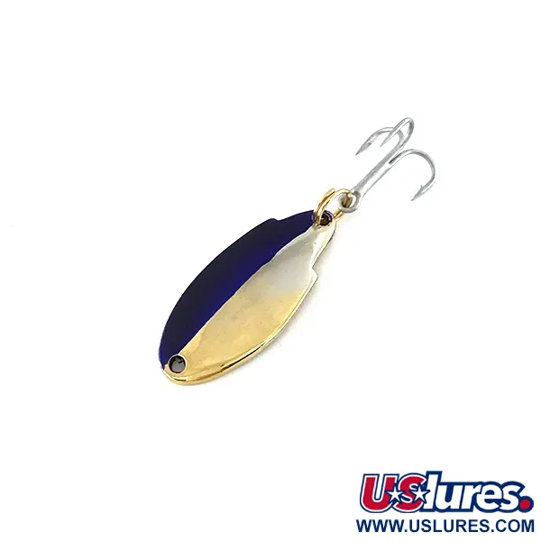 Auffällige zweifarbige Nickel- und Blau-Töne prägen diesen klassischen Acme Thunderbolt, ein Design, das speziell auf Forellen und Barschartige abgestimmt ist. Mit einer Länge von 1 1/4" (3 cm) und einem Gewicht von 1/8 oz (3,5 g) trägt dieser Blinker den Produktcode 8365 und steht für amerikanische Fertigung aus der Mitte des Jahrhunderts. Während die offiziellen Katalogdaten das Gewicht mit 1/8 oz (3,5 g) angeben, ist der Körper mit einer 1/10 oz Bezeichnung gestempelt – eine Nuance bei diesen gepressten Metallblinkern, die Sammler besonders schätzen. Ein hochglänzendes Nickel-Finish bedeckt die Unterseite, während die Oberseite eine klare Trennung zwischen dem polierten Metall und tiefblauer Farbe aufweist. Die Ausstattung besteht aus einem stabilen Sprengring und einem scharfen Drillingshaken, alles im Originalzustand mit einer Bewertung von 5/5. Das blaue Pigment bedeckt etwa die Hälfte der Oberseite und bildet einen markanten visuellen Kontrast zum polierten Nickel.