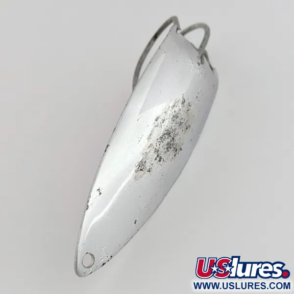 Auf der Unterseite des Blinkers ist deutlich der Schriftzug „ACME WEEDLESS MINNOW“ eingeprägt, ein Beleg für ein bereits 1951 patentiertes Design. Das Herzstück ist ein einzigartiger Dreifachhaken-Mechanismus, der krautsicher bleibt, bis ein Fisch zupackt und die Haken freigibt. Dieses Exemplar glänzt in klassischem Chrom-Finish und weist leichte Gebrauchsspuren aus der Tacklebox auf (Zustand 4/5). Mit einer Länge von 3" (7,5 cm) und einem Gewicht von 3/4 oz (24 g) ist er schwer genug für weite, präzise Würfe in dichte Vegetation oder Seerosenfelder. Die Innenkurve trägt zudem die Markierung „PAT. PENDING“, was ihn in die frühe Produktionsphase dieses US-Klassikers einordnet. Erfahrene Angler führen ihn langsam durch dichtes Kraut oder beschleunigen das Tempo in freien Wasserstellen.