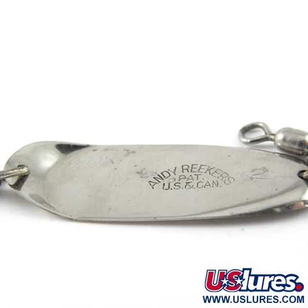 In die Metalloberfläche sind das „ANDY REEKERS“-Logo sowie Patentdetails für die USA und Kanada deutlich eingeprägt, was die traditionelle amerikanische Herkunft unterstreicht. Mit einer Länge von 1 1/2" (4 cm) weist dieser Blinker eine markante zweifarbige Optik mit einer polierten Nickel-Außenseite und einer bronzefarbenen Messing-Innenseite auf. Bei einem Gewicht von 3/32 oz (2,5 g) handelt es sich um ein spezielles Schleppangel-Werkzeug für Zielfische, die auf kleinere Beute fixiert sind. Die Montage für Artikelnummer 1164 umfasst einen Einzelhaken, der über einen Sprengring verbunden ist, sowie einen integrierten Tönnchenwirbel zur Vermeidung von Schnurverdrallung. Im Zustand 4/5 sind die Metalloberflächen sauber und gut erhalten, reflektieren das Licht effektiv und weisen minimale Altersspuren auf. Das schlanke Profil und die solide Metallkonstruktion sind charakteristisch für dieses spezielle in den USA gefertigte Schlepp-Design.