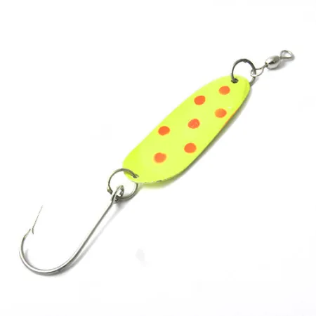 Mit roten Kreisen auf leuchtend gelbem Grund spiegelt der Andy Reekers 3 den unverwechselbaren visuellen Stil von Schlepplöffeln aus den USA der Mitte des Jahrhunderts wider. Dieses 4,5 g (3/16 oz) schwere Modell mit der Artikelnummer 0440 verfügt über ein einfaches, aber effektives Profil, das für einen stabilen Lauf in der Wassersäule entwickelt wurde. Die Rückseite ist in massivem Gelb gehalten und weist ein schwarz-gelbes Zielauge in der Nähe der Nase auf, das einen zusätzlichen Fixpunkt für nachfolgende Fische bietet. Er ist mit einem Einzelhaken und einem vorn montierten Wirbel ausgestattet, die entscheidend für die Stabilität und die Vermeidung von Schnurdrall beim Schleppfischen sind. Das Exemplar befindet sich in einem 5/5-Zustand und weist das originale Werksfinish sowohl am Körper als auch an den Hardware-Komponenten auf.