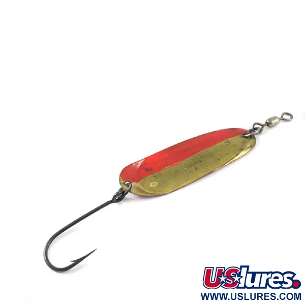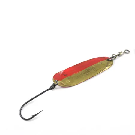 In den Messingkörper dieses 4,5 g (3/16 oz) schweren Blinkers sind Patentdaten eingestempelt, die bis in die 1920er Jahre zurückreichen, speziell der 16. Oktober 1923 und der 2. Februar 1926. Mit einer Länge von 5,0 cm (2") ist der Andy Reekers 3 ein klassischer amerikanischer Schleppköder, der für eine gleichmäßige Führung in der Wassersäule entwickelt wurde. Während das ursprüngliche Finish Messing ist, wurde auf einer Hälfte des Blattes ein roter Streifen angebracht – eine unter Anglern verbreitete Modifikation für eine kontrastreiche Sichtbarkeit. Das Ende des Blinkers ist direkt über der Hardware deutlich mit der Größe 3 gestempelt. Ausgestattet mit einem Einzelhaken und einem oben montierten Wirbel, zeigt der Köder sichtbare Gebrauchsspuren aus seiner Zeit in der Angelbox, was ihm eine Zustandsbewertung von 3/5 einbringt. Seine Konstruktion spiegelt die robuste Fertigung wider, die für US-Angelausrüstung aus der Mitte des Jahrhunderts typisch ist, und ist primär für Schlepptechniken im Süß- und Salzwasser gedacht.