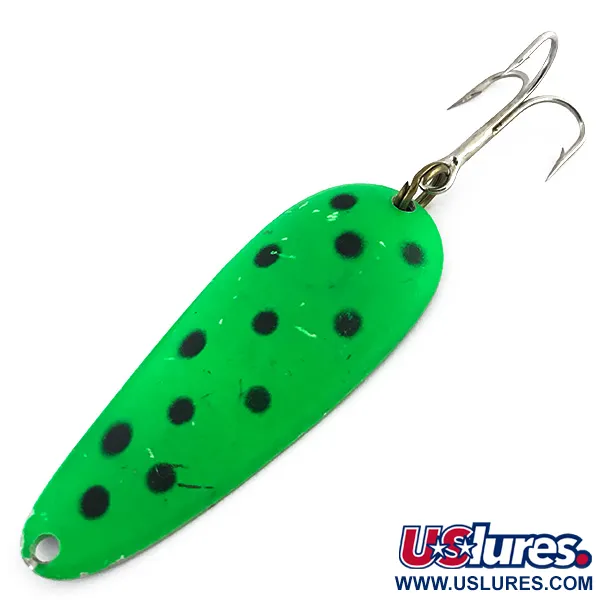 Mit schwarzen Punkten auf einem leuchtend grünen Finish erinnert dieses Vintage-Fundstück an das klassische Froschdekor, das bei Anglern des mittleren Jahrhunderts so beliebt war. Das Gewicht von 16g (3/5oz) bietet genügend Masse für weite Würfe an Krautkanten oder zum Schleppfischen entlang von Abbruchkanten. Die Rückseite des Köders besteht aus poliertem Nickel und sorgt für einen scharfen metallischen Blitz, der einen starken Kontrast zur lackierten Vorderseite bildet. Hergestellt in den USA von Nebco unter dem Produktcode 8841, weist der Blinker ein klassisches Tropfenprofil mit einer Länge von 7,5cm (3") auf. Er befindet sich in einem sehr guten Zustand mit einer Bewertung von 4/5 und weist nur geringe Altersspuren an den Beschlägen auf. Ein großer, scharfer Drillingshaken ist über einen Sprengring befestigt, sodass er bereit für die Vitrine oder den nächsten Einsatz am Wasser ist. Der Kopf des Blinkers verfügt über eine einzelne, sauber gebohrte Öffnung zur Befestigung des Vorfachs.