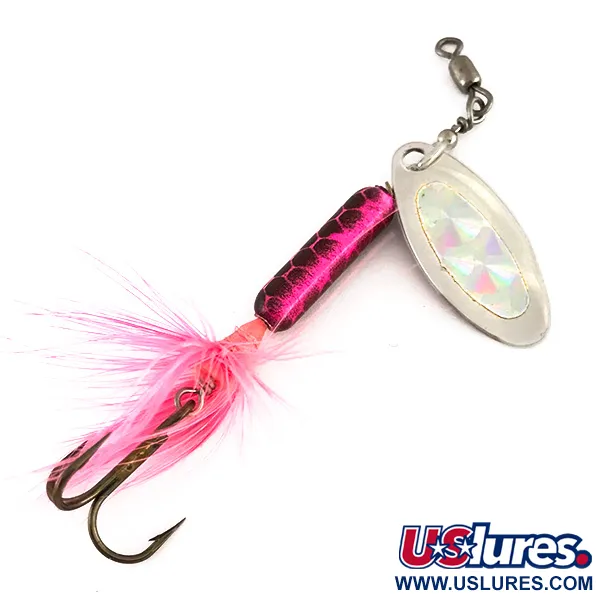 Mit einem Gewicht von 5,5 g (3/16 oz) ist dieses Exemplar ein Paradebeispiel für die in den USA hergestellte Luhr Jensen Bang Tail 2 Serie. Die 6 cm (2 1/4") Gesamtlänge setzt sich aus einem vernickelten Spinnerblatt mit prismatischem Lichtreflex-Inlay und einem pinkfarbenen zylindrischen Körper mit markantem schwarzem Wabenmuster zusammen. Unter dem Produktcode 7893 gelistet, verfügt der Köder über einen werkseitig montierten Wirbel an der Öse und einen scharfen Drilling, der mit einem leuchtend pinkfarbenen Federbusch verziert ist. Auf der Rückseite des Blattes befindet sich die deutliche Prägung „BANG TAIL“, die typisch für die frühen Serien des Herstellers ist. Mit einem Zustand von 5/5 weist der Spinner eine exzellente Oberflächengüte bei den Metall- und Lackteilen auf, wobei das Federkleid voll und gut erhalten ist.