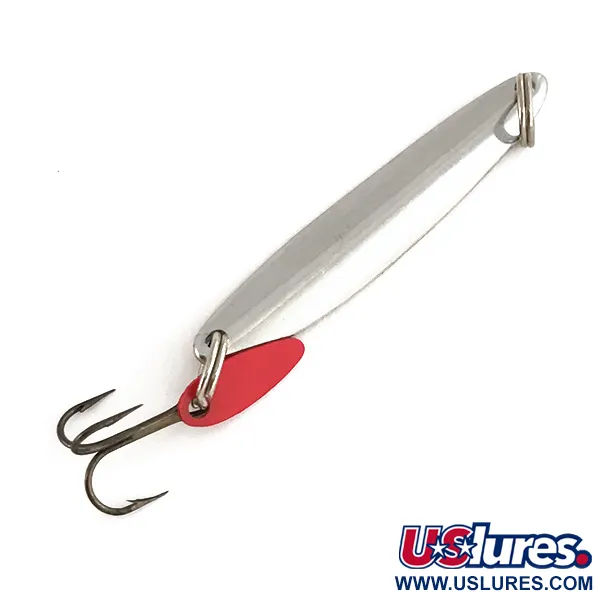 Mit einer Länge von 4,5 cm (1 3/4") ist dieser Klassiker für das Vertikalangeln von Bay de Noc mit einer markanten blauen Prismeneinlage auf einer polierten Nickeloberfläche ausgestattet. Mit einem Gewicht von 5,5 g (3/16 oz) ist der Köder – erkennbar an der Artikelnummer 7442 – ein Paradebeispiel für die Handwerkskunst aus Gladstone, Michigan, die das Eisfischen seit Generationen prägt. Das Design setzt auf einen schlanken, beschwerten Körper, der Präsentationen im Tiefwasser erleichtert, kombiniert mit dem ikonischen roten Flimmerblatt aus Kunststoff am unteren Sprengring. Diese Attraktorflosse dient als gezielter optischer Fixpunkt direkt am Bronze-Drilling. Der Köder befindet sich in einem exzellenten Zustand (Bewertung 5/5) mit sauberen Reflexionsflächen und robuster Hardware. Große Sprengringe an beiden Enden sorgen für eine sichere Schnurbefestigung und volle Beweglichkeit des Hakens beim vertikalen Jiggen oder Werfen.