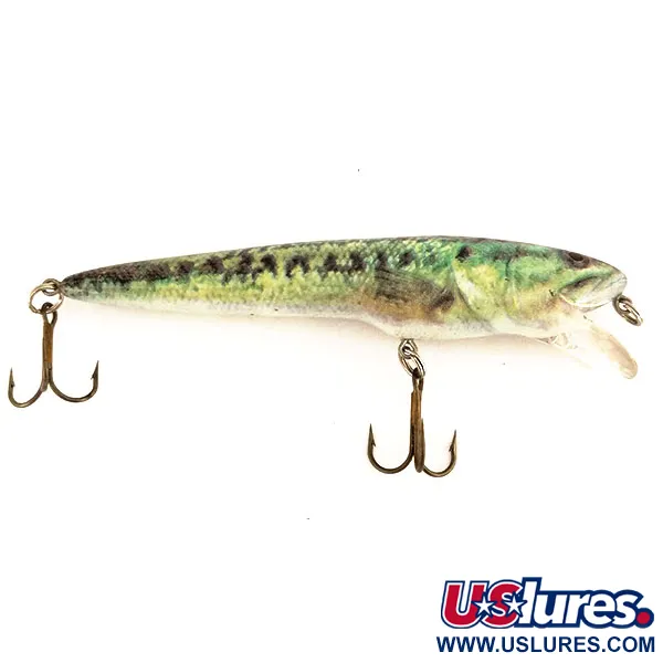 Mit einer Gesamtlänge von 10 cm (4 Zoll) ist dieser Berkley Frenzy FWD4S ein herausragender schwimmender Minnow aus der Produktionsserie mit dem Code 9597. Der Wobbler wiegt 14 g (1/2 oz) und ist mit einer klaren, abgerundeten Tauchschaufel ausgestattet, die eine Lauftiefe von 1,2 m (3,9 ft) erreicht. Sein Zustand wird mit 5/5 bewertet, wobei das fotorealistische Baby Bass-Dekor kräftig und frei von Abnutzungen bleibt. Das Muster weist einen dunkelgrünen Rücken auf, der in gelb-grüne Flanken übergeht, die durch die markanten dunklen Seitenflecken eines juvenilen Barsches gekennzeichnet sind. Zur Ausstattung dieses in den USA gefertigten Köders gehören originale, dunkel beschichtete Drillingshaken und ein stabiler Nasen-Sprengring. Berkley nutzte diese realistische Ästhetik, um die Lücke zwischen traditionell bemalten Ködern und modernen High-Definition-Oberflächen zu schließen. Ein Satz dunkler, fixierter Augen bietet einen natürlichen Fixpunkt am Kopf des Wobblers.