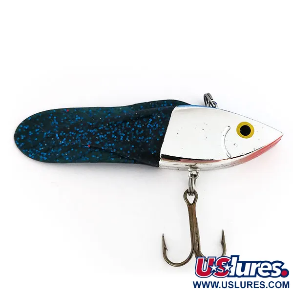 Ein reflektierendes Mirror-Finish bedeckt den Kopfbereich des Berkley PowerBait Power Rattle, der 1/2oz (14g) auf die Waage bringt. Dieses Hybrid-Design mit dem Produktcode 9782 kombiniert einen harten Rasselkopf mit wechselbaren Gummischwänzen. Das verchromte Kopfsegment verfügt über ein markantes gelbes Auge und einen roten Kehlakzent, gefolgt von einem sicheren Befestigungspunkt für die aromatisierten Schwänze. Im Lieferumfang dieses 2 1/2" (6,5 cm) langen Köders sind zwei verschiedene PowerBait-Schwanzoptionen enthalten – eine lange, blau glitzernde Version und ein kürzerer, dunkelrot geflockter Schwanz – was Profilanpassungen beim Werfen oder Schleppen in variablen Tiefen ermöglicht. Der Bauch ist mit einem scharfen Drillingshaken an einem robusten Sprengring ausgestattet. Als hervorragend erhaltenes Sammlerstück weist er einen Zustand von 5/5 auf, ohne sichtbare Abnutzung am Metallkopf oder den Weichplastikkomponenten. Die Öse befindet sich auf der Oberseite des Kopfes, um die Stabilität beim Einholen durch die Wassersäule zu gewährleisten.