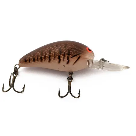 Ein klassisches Wabenschuppenmuster prägt das Brown-Craw-Dekor dieses 5 cm langen Crankbaits, der dunkle vertikale Streifen an den Flanken aufweist. Die transparente Tauchschaufel ist für Lauftiefen zwischen 1,8 und 2,4 m ausgelegt und ermöglicht effektives Werfen sowie Schleppfischen in unterschiedlichen Strukturen. Dieses spezielle Exemplar mit dem Produktcode 18132 befindet sich in einem Zustand von 5/5, hat einen sauberen Körper und auffällige rote Augen, die einen deutlichen Fixpunkt bilden. Der schwimmende, 11 g schwere Körper ist mit internen Rasseln ausgestattet, um Bisse von Hechten und Zandern zu provozieren. Die Originalausstattung besteht aus zwei Drillingen am Bauch und am Schwanz, die in einem hervorragenden Zustand sind.