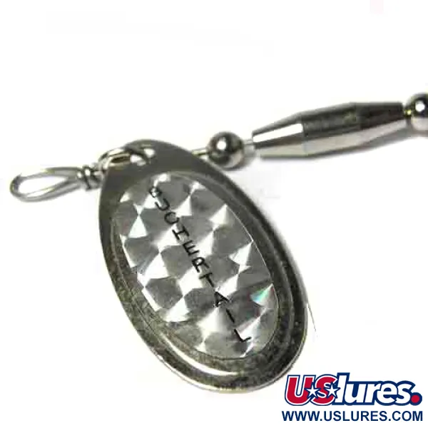 Vernickelte Blätter mit einem markanten holografischen Schuppenmuster kennzeichnen diesen Buchertail 500 als klassischen mittelgroßen Spinner. Mit einem Gewicht von 17 g (3/5 oz) verfügt diese Joe Bucher-Kreation über einen beschwerten Körper aus silberfarbenen Metallperlen, die den nötigen Ballast für weite Würfe an Krautkanten oder über versunkenem Holz bieten. Das dichte schwarze Bucktail ist mit einer markanten roten Garnwicklung fixiert, die als optischer Bisspunkt direkt vor dem hinteren Drillingshaken dient. Dieses Exemplar mit dem Produktcode 0017 zeigt die robuste amerikanische Bauweise, für die die Marke bei der Jagd auf Trophäenhechte und Muskies bekannt ist. Der reflektierende Hologramm-Aufkleber auf dem Blatt bleibt lebendig und wurde entwickelt, um Lichtreflexe bei verschiedenen Sichtverhältnissen zu maximieren. In Bezug auf den physischen Zustand hat der Köder eine Bewertung von 4/5 und bleibt sauber und gut gepflegt. Er verwendet eine hochbelastbare, drahtgewickelte Öse für eine sichere Vorfachbefestigung – ein Markenzeichen der einfachen, effektiven Hardware, für die Joe Bucher bekannt ist.