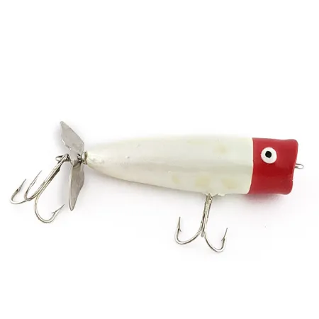 Ein klassisches Red-Head-Dekor zeichnet dieses Modell aus, bestehend aus einem leuchtend roten Kopfbereich auf einem perlweiß schimmernden Gummikörper. Mit einem Gewicht von 14 g (1/2 oz) und einer Länge von 7 cm (2 3/4") repräsentiert dieser Oberflächenköder der Burke Flexo-Products Company die besondere Ära der in Michigan hergestellten Gummiköder aus der Zeit zwischen 1950 und 1993. Die weiche Konstruktion mit dem Produktcode 23204 wurde speziell für das Popping an der Oberfläche entwickelt und verfügt über ein konkaves Maul sowie einen markanten Metallpropeller am Heck, um Wasserverdrängung zu erzeugen. Ein am Bauch montierter Drillingshaken wird durch einen zweiten Drilling ergänzt, der hinter dem Heckpropeller mitläuft. Die aufgemalten Augen sind gut erhalten, und der Gesamtzustand 4/5 zeigt, dass der Gummi geschmeidig geblieben ist, mit nur geringfügigen, altersbedingten Oberflächenspuren. Burke war bekannt für diese „Live Action“-Designs, die auf ein haptisches Erlebnis setzten, das sich deutlich von den Hartplastikködern zeitgenössischer Hersteller unterschied.