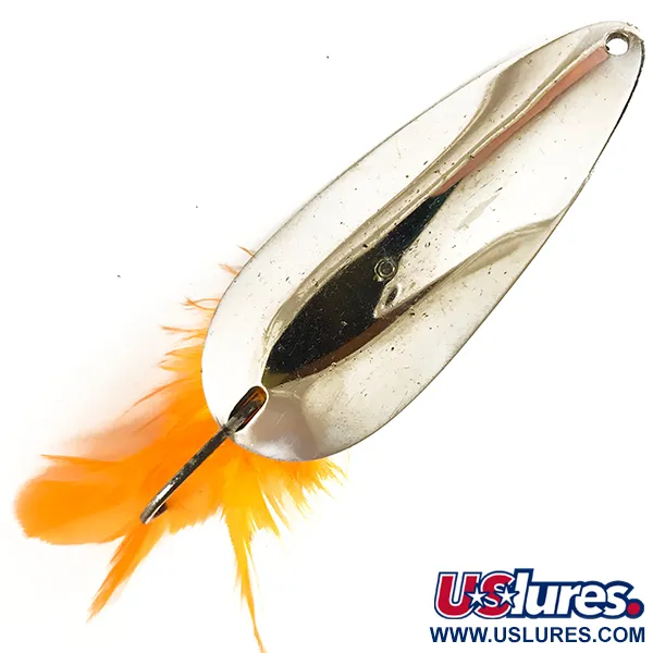 Mit den eingeprägten Namen „ACCETTA“ und „Weed-Dodger“ ist dieser vernickelte Blinker ein klassisches Beispiel für das Weedless-Design der Jahrhundertmitte. Ein Gewicht von 2/3oz (19g) macht ihn massiv für seinen 2 1/2" (6,5cm) langen Körper. Seine polierte Nickeloberfläche reflektiert das Licht effizient, während ein leuchtendes Büschel orangefarbener Federn am Einzelhaken als optischer Fixpunkt dient. Der Weed-Dodger verfügt über einen speziellen Drahtschutz, der Seerosenblätter und dichte Vegetation von der Hakenspitze ablenkt und so Würfe in dickes Kraut ermöglicht. Mit 5/5 bewertet, zeigt der Köder ein beeindruckend sauberes Finish mit scharfer Beschriftung. In der Datenbank unter dem Produktcode 3607 geführt, repräsentiert er den praktischen Erfindergeist, den Tony Accetta in die Angelindustrie brachte. Ein stabiler Einzelhaken ist direkt in den Körper integriert und durch eine verschraubte Platte gesichert, die auch den metallischen Krautschutz verankert.
