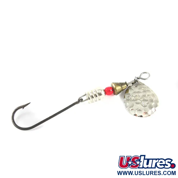 Die gehämmerte Oberfläche des tropfenförmigen Blattes fängt das Licht aus verschiedenen Winkeln ein und erzeugt einen hellen Nickelreflex. Dieser klassische Inline-Spinner von Cabela's mit der Artikelnummer 1542 ist 7 cm lang und ein robustes Beispiel für funktionales Tackle-Design. Mit einem Gewicht von 4 g ist er die ideale Wahl für das ultraleichte Angeln auf Forellen oder barschartige Fische. Der Aufbau umfasst eine leuchtend rote Perle zwischen einem messingfarbenen konischen Spacer und einem silberfarbenen gerippten Körperabschnitt für visuellen Kontrast. Montiert auf einem langschenkligen Einzelhaken, ist diese Konfiguration für Angler gedacht, die eine einfachere Alternative zu Drillingshaken bevorzugen. Das Nickel-Finish ist sehr gut erhalten, das Cabela's-Logo ist deutlich auf der Vorderseite des Blattes eingeprägt, bei einem Gesamtzustand von 5/5.