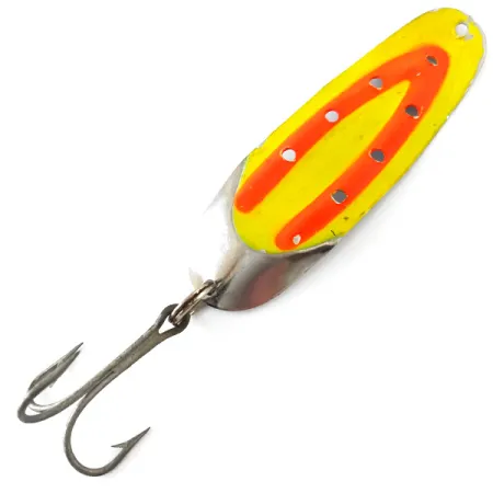 Die Vernickelung sorgt für ein spiegelähnliches Finish auf der Rückseite dieses Modells 5513, das die markante Prägung des Designers J. Rustowicz trägt. Mit einem Gewicht von 12,5 g (2/5 oz) nutzt der Charger №3 UV ein hochsichtbares fluoreszierendes gelb-rotes Muster, das durch neun spezielle UV-reaktive Punkte ergänzt wird, die in tiefem oder trübem Wasser leuchten. Dieses in den USA hergestellte Exemplar ist 8 cm (3 1/4") lang und repräsentiert die Weiterentwicklung der Marke, die heute von Lake Products hergestellt wird. Der Zustand ist eine solide 5/5 und weist eine bemerkenswert saubere Oberfläche und eine lebendige Lackierung auf, die wie frisch vom Arbeitstisch wirkt. Die Form basiert auf einem traditionellen Blinker-Profil, gepaart mit einem stabilen Drillingshaken, der über einen hochbelastbaren Sprengring für zuverlässiges Auswerfen oder Schleppangeln befestigt ist. Das fluoreszierende Finish ist direkt in den oberen Emaillelack integriert, wodurch sichergestellt wird, dass die UV-Eigenschaften unter verschiedenen Lichtverhältnissen wirksam bleiben.