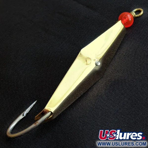 Auf der Innenseite ist deutlich 'THE GENUINE CLARK SQUID ST. PETE., FLA.' eingeprägt, was diesen Köder als ein authentisches Werk von James E. Clark von der Küste Floridas ausweist. Der Köder wiegt 1/4oz (8g) und besticht durch ein markantes, rautenförmiges Profil mit einer polierten Goldbeschichtung, die das Licht über mehrere Facetten reflektiert. Eine einzelne rote Perle am Kopfende nahe der Einhängeöse setzt einen dezenten optischen Reiz gegenüber dem metallischen Körper. Das krautsichere Design verwendet einen stabilen Einzelhaken, der durch eine zentrale Schraube gesichert ist – ein Markenzeichen für den funktionalen Ansatz des Herstellers beim Küstenangeln. Dieses Exemplar mit der Artikelnummer 18817 befindet sich in einem Zustand von 5/5, mit einer glänzenden, reflektierenden Oberfläche und sauberen Kleinteilen. Der Haken ist über einen kleinen Montageblock auf der konkaven Seite in die Geometrie des Löffelblinkers integriert.