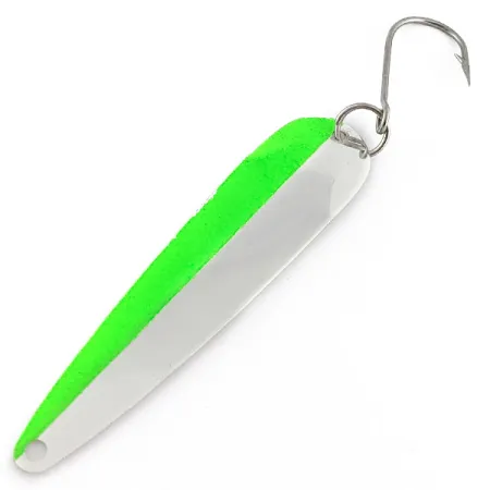 Mit einem Gewicht von 4,5 g (3/16 oz) ist das schlanke Profil dieses in den USA hergestellten Blinkers speziell für Präsentationen in klarem Wasser konzipiert, bei denen ein gezielter Lichtreiz erforderlich ist. Ein leuchtend neongrüner Streifen verläuft entlang der Außenkante des polierten Nickelkörpers und bildet einen auffälligen Kontrast zur reflektierenden Metalloberfläche. Dieses Modell Clear Water 101 mit dem Produktcode 23201 hat eine Länge von 8 cm (3 1/4") und besitzt die klassische, verjüngte Form, die für traditionelle Wurf- und Schleppblinker typisch ist. Das Heck des Köders ist mit einem robusten Einzelhaken ausgestattet, der durch einen stabilen Sprengring gesichert ist – eine Montage, die von Forellen- und Lachsanglern wegen der sicheren Hakeigenschaften und des geringeren Hängerrisikos bevorzugt wird. Auf der Rückseite ist der Markenname direkt in das saubere Nickel-Finish eingeprägt. Dieses Exemplar befindet sich in einem makellosen Zustand (5/5) und weist keinerlei Gebrauchsspuren auf den lackierten oder beschichteten Oberflächen auf. Die Öse zur Schnurbefestigung an der Spitze ist einwandfrei und bereit für den Einsatz.