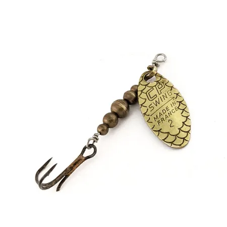 Die auf dem Messingblatt deutlich eingeprägte Zahl „2“ kennzeichnet die Größe dieses klassischen französischen Spinners von C.P. Swing. Mit einem Gewicht von 3/32 oz (2,7 g) und einer Länge von 2" (5 cm) stellt er einen Standard für das Angeln auf Forellen und Barsche mit leichtem Gerät dar. Der massive Messingaufbau erstreckt sich vom ovalen Blatt mit Schuppenprägung bis hin zu den abgestuften Metallperlen, die das Körpergewicht bilden. Dieser mit dem Produktcode 12622 gekennzeichnete Köder wird mit 4/5 bewertet; während der Spinner selbst gut erhalten ist, wurde eine Spitze des Drillingshakens zuvor abgekniffen. Die Gravur „MADE IN FRANCE“ ist nach wie vor scharf und zeugt von der Fertigungsqualität dieser europäischen Köder aus der Mitte des letzten Jahrhunderts.