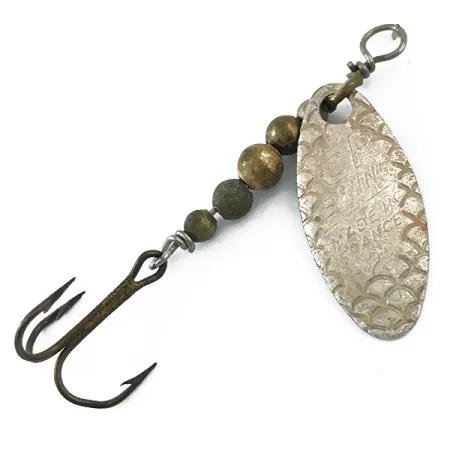 Deutlich in das strukturierte, silberglänzende Metall eingeprägt, weist die Kennzeichnung „MADE IN FRANCE“ auf dem Blatt auf die klassische Herkunft dieses 5 cm langen CP-Swing 2 hin. Mit einem Gewicht von 2,7 g verfügt dieses Modell über ein tropfenförmiges Blatt mit einem markanten Schuppenmuster, das ein Markenzeichen der frühen Produktion unter dem Produktcode 5563 war. Der Körper besteht aus fünf abgestuften Messingperlen, die den notwendigen Ballast für das Auswerfen an feiner Schnur liefern. Dieser Spinner zeigt seine Geschichte mit einer sanften, gealterten Patina auf den Metalloberflächen und weist eine Zustandsbewertung von 4/5 auf, während er strukturell einwandfrei bleibt. Der originale Drilling ist sicher an der drahtumwickelten Schlaufe am Ende der Perlen befestigt. Eine Prägung der Größe 2 ist direkt über dem Herkunftsland sichtbar, was auf sein spezielles Design für Forellen- oder Barschtechniken hinweist.