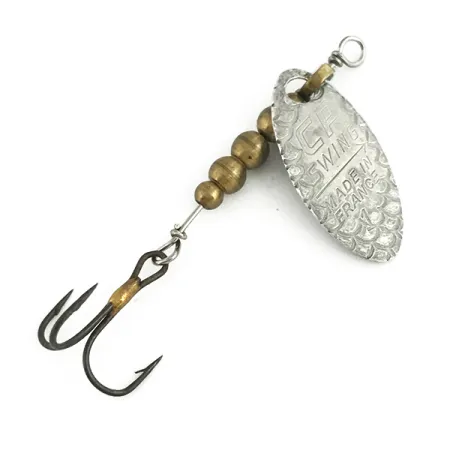 Die Prägung auf dem silbernen Blatt weist auf eine französische Herkunft hin – ein Markenzeichen für diese klassischen CP-Swing Spinner, die häufig in Nordamerika vertrieben werden. Dieser 1 3/4" (4,5 cm) Inline-Köder verfügt über ein texturiertes Schuppenmuster auf dem silbernen Blatt, kombiniert mit einem Körper aus vier abgestuften Messingperlen. Mit einem Gewicht von 3/32 oz (2,5 g) ist der Köder für präzise Würfe in leichter Strömung oder stehendem Gewässer ausbalanciert. Dieses Exemplar mit der Artikelnummer 7293 befindet sich in ausgezeichnetem Zustand (Bewertung 5/5), wobei die Schriftzüge „MADE IN FRANCE“ und „CP SWING“ auf dem Metall deutlich lesbar sind. Ein einzelner Drilling ist am Ende montiert, befestigt an einer Drahtachse, die in einer sauberen oberen Öse für das Vorfach endet. Der Kontrast zwischen dem silbernen Blatt und dem Messingkörper bleibt über die gesamte Montage hinweg scharf und glänzend.