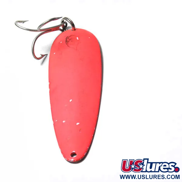 Mit einem Gewicht von 28 g (1 oz) bietet dieser Köder ein beachtliches Profil für Sammler und aktive Angler. Mit einer Länge von 9 cm (3 1/2") ist die konvexe Seite in Dunkelrot / Rosa gehalten und weist die charakteristischen weißen Sprenkel sowie das gepresste Imp-Logo auf. Die Rückseite zeigt eine silberne, konkave Oberfläche mit der Prägung „DARDEVLE DETROIT USA“, ein Hinweis auf das Erbe von Eppinger aus Michigan. Dieses Exemplar mit dem Produktcode 0244 ist mit einem stabilen Drilling und einem Sprengring ausgestattet. Der Zustand wird mit 4/5 bewertet, wobei leichte Alterserscheinungen wie geringfügiger Lackverlust an der Öse und den Kanten erkennbar sind. Die metallische Innenseite ist sauber und reflektiert das Licht gut.