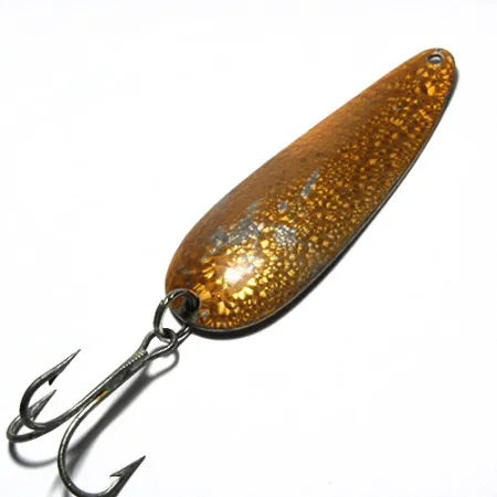 Mit einer Länge von 3 1/2 Zoll (9 cm) repräsentiert dieser Blinker die robuste Seite des Eppinger-Sortiments. Dieses spezielle Dardevle-Modell mit dem Produktcode 0306 besticht durch das markante Crystal (Golden Scale)-Finish – ein strukturiertes, bernsteinfarbenes Muster, das darauf ausgelegt ist, Licht unter verschiedensten Wasserbedingungen einzufangen. Mit einem beachtlichen Gewicht von 1 oz (28 g) bietet er die nötige Masse für Präsentationen im tiefen Wasser oder weite Würfe. Auf der konkaven Seite ist der klassische DARDEVLE-Stempel tief in das Metall eingeprägt, ein Markenzeichen der 1906 von Lou Eppinger in Detroit, Michigan, gegründeten Firma. Der originale große Drilling ist über einen stabilen Sprengring montiert und einsatzbereit. Das Golden Scale-Finish weist eine leichte Ausdünnung und ehrliche Gebrauchsspuren auf der strukturierten Oberfläche auf, wodurch das helle Basismetall stellenweise durchscheint, insbesondere im Mittelteil und an den Kanten. Dieses Exemplar ist sauber, behält eine starke ästhetische Präsenz und verdient eine Zustandsbewertung von 3/5. Es ist ein echtes Stück amerikanischer Angelgeschichte und spiegelt die langlebige Bauweise wider, aufgrund derer diese Köder einst sogar in Überlebenskits der Militärluftfahrt enthalten waren.