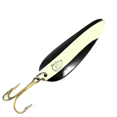 Ein markanter, cremeweißer diagonaler Streifen durchbricht das schwarze Finish dieses 28g (1oz) Eppinger Blinkers und macht ihn zu einer kontrastreichen Wahl für verschiedene Lichtverhältnisse. Dieses spezielle Dardevle Exemplar mit dem Produktcode 0905 hat eine Länge von 9cm (3 1/2") und zeigt das klassische geprägte Teufelskopf-Logo, das die Marke seit Lou Eppingers frühen Tagen in Michigan prägt. Der Blinker verfügt über eine polierte Nickelrückseite und ist mit einem stabilen Drillingshaken ausgestattet, der durch einen hochbelastbaren Sprengring gesichert ist – ideal sowohl für das Wurfangeln als auch für das Schleppen. Historisch gesehen verlegte Eppinger die Produktion 1959 von Detroit nach Dearborn und verwendet weiterhin seine hauseigenen Prägestempel, um diese präzise längliche, konkave Geometrie zu erreichen. Das Finish ist mit einer Zustandsbewertung von 4/5 gut erhalten und zeigt nur leichte Gebrauchsspuren. Ein dunkler Köder wie dieser ist eine solide Wahl für jeden Angler, da die Silhouette bei unterschiedlichen Sichtverhältnissen unter Wasser deutlich sichtbar bleibt.