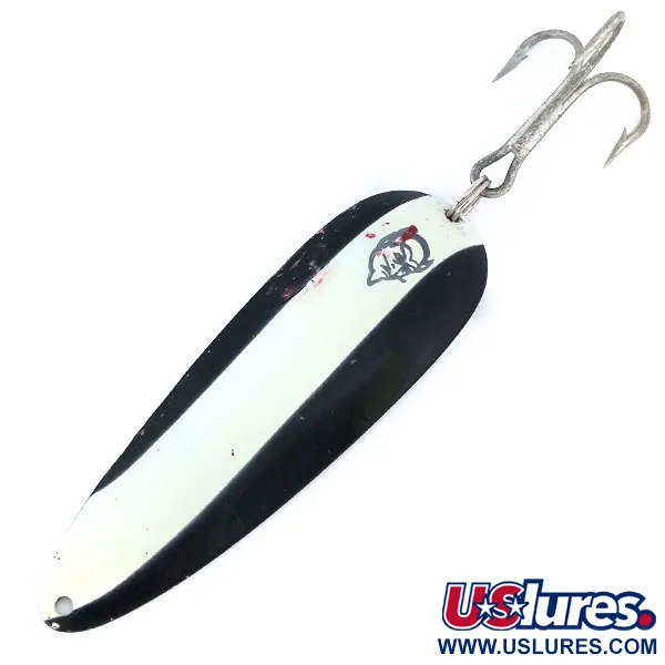 Die Vernickelung auf der Rückseite sorgt für einen kontrastreichen Glanz gegenüber den schwarz-weißen Streifen auf der Vorderseite dieses 28 g (1 oz) schweren Löffelblinkers. Die Marken Eppinger und Dardevle sind deutlich in die Metallrückseite eingeprägt und zeugen von der langen Tradition, die 1906 in Lou Eppingers Werkstatt in Detroit begann. Mit einer Länge von 9 cm (3 1/2") weist dieses Modell das klassische Teufelskopf-Logo mit dem charakteristischen roten Lackdetail auf der konkaven Seite auf. Dieser spezielle Köder mit der Artikelnummer 11016 befindet sich in einem 4/5-Zustand mit gut erhaltenem Lack und sauberem Zubehör. Der robuste Drillingshaken ist mit einem stabilen Sprengring befestigt, der für die Belastungen beim Fischen auf große Süßwasser-Raubfische ausgelegt ist. Eine einzelne Öse am verjüngten Ende ermöglicht die Montage für klassisches Wurfangeln oder Schleppfischen. Das kontrastreiche Farbschema ist eine vielseitige Wahl für unterschiedliche Sichtverhältnisse im Wasser.