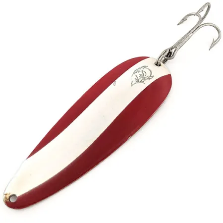 Die Prägung „DARDEVLE DETROIT, U.S.“ auf der polierten Nickelrückseite verankert dieses Exemplar in der frühen Geschichte des legendären Herstellers aus Michigan vor seinem Umzug nach Dearborn im Jahr 1959. Dieser Eppinger Dardevle, identifiziert durch den Produktcode 12981, weist das ikonische diagonal rot-weiß gestreifte Muster auf seiner konvexen Vorderseite auf. Mit einem Gewicht von 28 g (1 oz) und einer Länge von 9 cm (3 1/2") ist er ein massiver Löffelblinker, der für das Wurfangeln oder Schleppen auf größere Süßwasserraubfische konzipiert wurde. Das markante Teufelskopf-Logo ist deutlich auf der silbernen Streifung zu erkennen und kennzeichnet ihn als echtes Stück amerikanischer Angelkunst. Dieser Köder befindet sich in ausgezeichnetem Zustand (Bewertung 5/5), mit leuchtender Emaille und durchgehend sauberen Metalloberflächen. Ein großer Drillingshaken im Originalstil ist über einen stabilen Sprengring am breiten Ende befestigt, während die einzelne Schnuröse an der schmalen Spitze scharfkantig und frei bleibt. Dieses Design wird aufgrund seiner Effektivität so geschätzt, dass ähnliche Modelle einst in Überlebenssets für die Luftfahrt der US-Regierung enthalten waren.