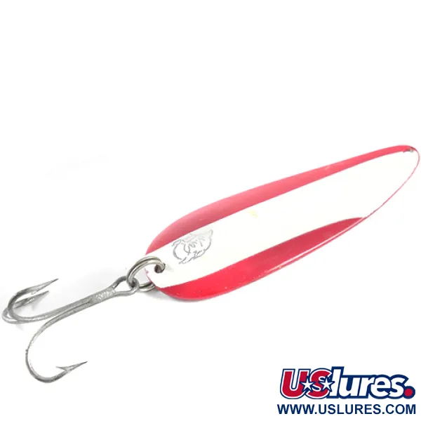Markante rote Ränder flankieren einen klaren weißen Mittelstreifen auf der konvexen Vorderseite dieses 9 cm (3 1/2") langen Eppinger-Exemplars. Auf der Rückseite findet sich ein warmes Kupferfinish, das mit der Prägung 'DARDEVLE DETROIT, U.S.A.' versehen ist – ein Detail, das die frühe Fertigungsgeschichte der Marke widerspiegelt, bevor das Unternehmen 1959 nach Dearborn umzog. Dieser spezifische Dardevle, geführt unter dem Produktcode 1472, hat ein Gewicht von 28 g (1 oz), was die nötige Dichte für weite Würfe und eine gleichmäßige Köderführung durch tiefere Strukturen bietet. Das markentypische Teufelskopf-Logo ist auf der weißen Lackierung deutlich sichtbar, und die Hardware ist nach wie vor robust. Sein Zustand ist exzellent und verdient eine solide 5/5-Bewertung für sein gepflegtes Finish und seine strukturelle Integrität. Jede Kurve des Metallkörpers wird durch hauseigene Matrizen geformt, was die echten Laufeigenschaften garantiert, die in den USA hergestellte Eppinger-Köder seit über einem Jahrhundert definieren.