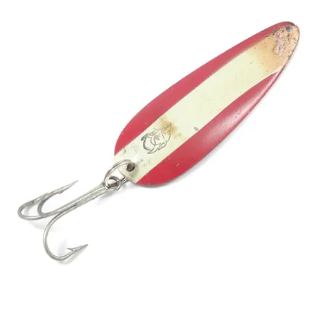 Mit einer Länge von 9 cm (3 1/2") trägt dieser Eppinger-Blinker das kontrastreiche Dekor in Rot/Weiß/Nickel, das seit über einem Jahrhundert zur Standardausrüstung in jeder Köderbox gehört. Der 28 g (1 oz) schwere Körper mit der Artikelnummer 2092 zeigt die klassische Teufelskopf-Grafik, die mittig auf dem weißen Streifen der lackierten Seite platziert ist. Auf der Rückseite zeigt der Köder ein sauberes Nickel-Finish mit der Prägung „DARDEVLE DETROIT, U.S.A.“, was ihn als Teil der traditionsreichen Angelgeschichte Michigans ausweist. Das Exemplar befindet sich in einem Zustand von 4/5 und weist einige oberflächliche Gebrauchsspuren sowie leichte Lackabplatzer an den Kanten auf, die vom Einsatz beim Spinnfischen rühren, ist aber insgesamt gut erhalten. Ein großer, silberfarbener Drilling ist sicher montiert, sodass der Köder sofort einsatzbereit ist, um aggressive Raubfische sowohl beim Werfen als auch beim Schleppen zu überlisten. Die massive Metallbauweise ist auf Langlebigkeit ausgelegt, wenn im Drill mit schweren Fischen in tiefem Wasser oder starker Strömung hohe Belastungen auftreten.