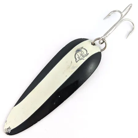 Mit einem Gewicht von beachtlichen 28 g bietet der massive Metallkörper dieses Blinkers die nötige Masse für weite Würfe. Das Farbmuster „Black Devle“ sorgt für hohe Kontrastwirkung und zeichnet sich durch einen knochenweißen Mittelstreifen zwischen tiefschwarzen Flächen aus, ergänzt durch die klassische Teufelskopf-Grafik. Mit einer Länge von 9 cm trägt der Köder auf der Rückseite die Prägung „DARDEVLE BY EPPINGER DEARBORN MI“, was auf seine Produktion nach dem Umzug des Unternehmens aus Detroit im Jahr 1959 hinweist. Der unter dem Produktcode 23379 geführte Köder verfügt über den originalen silbernen Drilling und Sprengring. Der Zustand ist mit 4/5 bewertet, mit nur leichten Kratzern auf der verchromten Rückseite und kleinen Lackabplatzern an der Spitze nahe der Öse. Die markante längliche Form und die konkave Wölbung erzeugen beim Einkurbeln eine taumelnde Aktion im Wasser. Dieser in den USA hergestellte Blinker nutzt sein Eigengewicht, um beim Angeln auf Hecht oder große Forellen zuverlässig auf Tiefe zu bleiben. Gewichtsangabe und Herstellerdetails sind tief in den Metallrücken eingeprägt, sodass die Markierungen dauerhaft lesbar bleiben.
