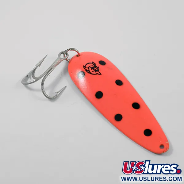 Dieser klassische Wurflöffel mit einem Gewicht von 28 g (1 oz) ist ein echtes Stück Angelgeschichte aus Detroit, Michigan. Die Vorderseite besticht durch ein gut sichtbares, leuchtend pinkes Finish, das mit sieben schwarzen Punkten und dem ikonischen Eppinger-Teufelslogo verziert ist. Der 9 cm (3 1/2") lange Blinker ist auf seiner polierten Nickel-Rückseite mit „DARDEVLE DETROIT USA“ gestempelt, was seine authentische Herstellung bestätigt. Dieses Exemplar mit dem Produktcode 2695 befindet sich in einem 5/5-Zustand mit erhaltenem Glanzemaille und klarer Beschriftung auf dem Metall. Die Ausstattung umfasst einen stabilen Drilling, der mit einem robusten Sprengring befestigt ist, ideal für große Süßwasser-Raubfische wie Hecht oder Muskellunge. Lou Eppingers proprietäre Formgebung zeigt sich im tiefen, konkaven Profil – ein Designelement, das seit den Anfangsjahren des Unternehmens nahezu unverändert geblieben ist. Der Kontrast zwischen der leuchtend pinken Oberseite und der reflektierenden Nickel-Rückseite sorgt für Sichtbarkeit bei unterschiedlichsten Lichtverhältnissen.