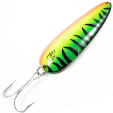 Die leuchtende FireTiger-Färbung sorgt für ein hochsichtbares Profil bei diesem 28g (1oz) schweren Blinker. Die Vorderseite geht in lebhaften Schattierungen von Orange, Gelb und Grün ineinander über, unterbrochen von scharfen schwarzen vertikalen Streifen und der ikonischen Logoprägung. Dreht man den Köder um, findet man ein poliertes Messing-Finish, bei dem das Gewicht sauber in das Metall eingeprägt ist – ein Markenzeichen der firmeneigenen Matrizen, die Eppinger seit dem Umzug des Betriebs nach Dearborn, Michigan, im Jahr 1959 verwendet. Mit einer Länge von 9cm (3 1/2") ist die ausgeprägte konkave Form des Blinkers für eine konstante Köderführung beim Spinnfischen oder Schleppangeln ausgelegt. Die Ausstattung besteht aus einem robusten silberfarbenen Drilling, der durch einen Sprengring gesichert ist. Dieses Exemplar mit dem Produktcode 3776 weist ein außergewöhnlich sauberes Finish auf und verdient eine Bewertung von 5/5.