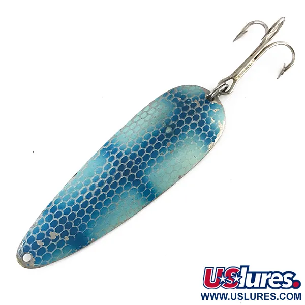 Die deutlich in die polierte, konkave Seite eingeprägte Markierung „Dardevle“ Detroit U.S.A. verankert die Identität dieses Eppinger-Klassikers. Dieser 9 cm (3 1/2") lange Blinker verfügt über eine hellblaue Grundierung, die mit einem dunkleren blauen Waben-Schuppenmuster überzogen ist. Die Unterseite ist in einem sauberen Nickel-Finish gehalten, das bei gleichmäßigem Einholen oder beim Schleppfischen für einen kontrastreichen Lichtreflex sorgt. Dieses mit dem Produktcode 8410 gekennzeichnete 28 g (1 oz) schwere Exemplar ist aus dem starken Metall gefertigt, das Lou Eppingers Designs seit 1906 zu einem festen Bestandteil in den Angelkisten von Michigan gemacht hat. Der originale Drilling ist mit einem stabilen Sprengring befestigt und bereit für schwere Würfe. Was den Zustand betrifft, verdient dieser Fang eine 4/5 Bewertung; während an den Außenkanten ein leichter Lackverlust und eine leichte Ausdünnung der Schuppen zu verzeichnen ist, bleibt das Metall glänzend und die Prägung scharf. Es ist ein Beweis für die Fertigungsmatrizen, die Eppinger vor und nach dem Umzug nach Dearborn im Jahr 1959 verwendete. Das Gewicht von 28 g (1 oz) ermöglicht es diesem Blinker, tiefere Wasserschichten effektiv zu erreichen, ohne dass zusätzliche Senker erforderlich sind.